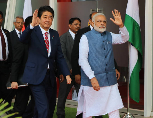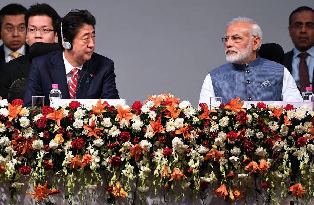 GANDHINAGAR, INDIA – SEPTEMBER 14: Indian Prime Minister Narendra Modi and Japanese Prime Minister Shinzo Abe during India-Japan Annual Summit at Mahatma Mandir on September 14, 2017 in Gandhinagar in Gujarat, India. Prime Minister Narendra Modi and his Japanese counterpart Shinzo Abe on Thursday laid the foundation of India’s first high speed rail project, linking country’s commercial capital Mumbai to Ahmedabad, the main city in Modi’s home state Gujarat. The two countries also inked 15 agreements, including one to give a fillip to India’s Act East policy by enhancing connectivity and developmental projects in India’s northeast, and for more flights between the two countries. (Photo by Siddharaj Solanki/Hindustan Times via Getty Images)